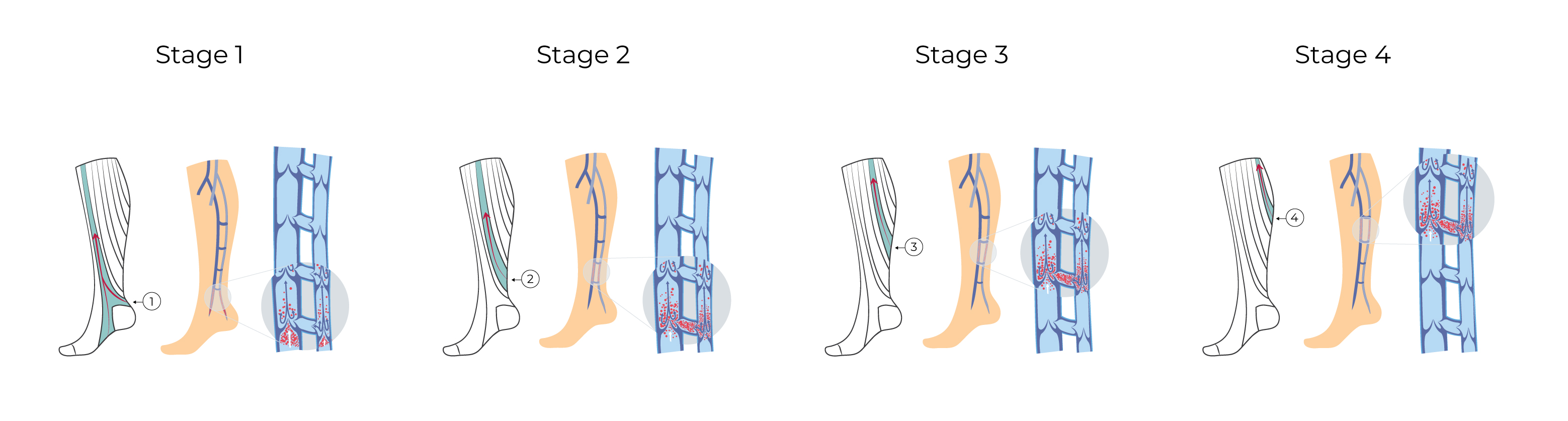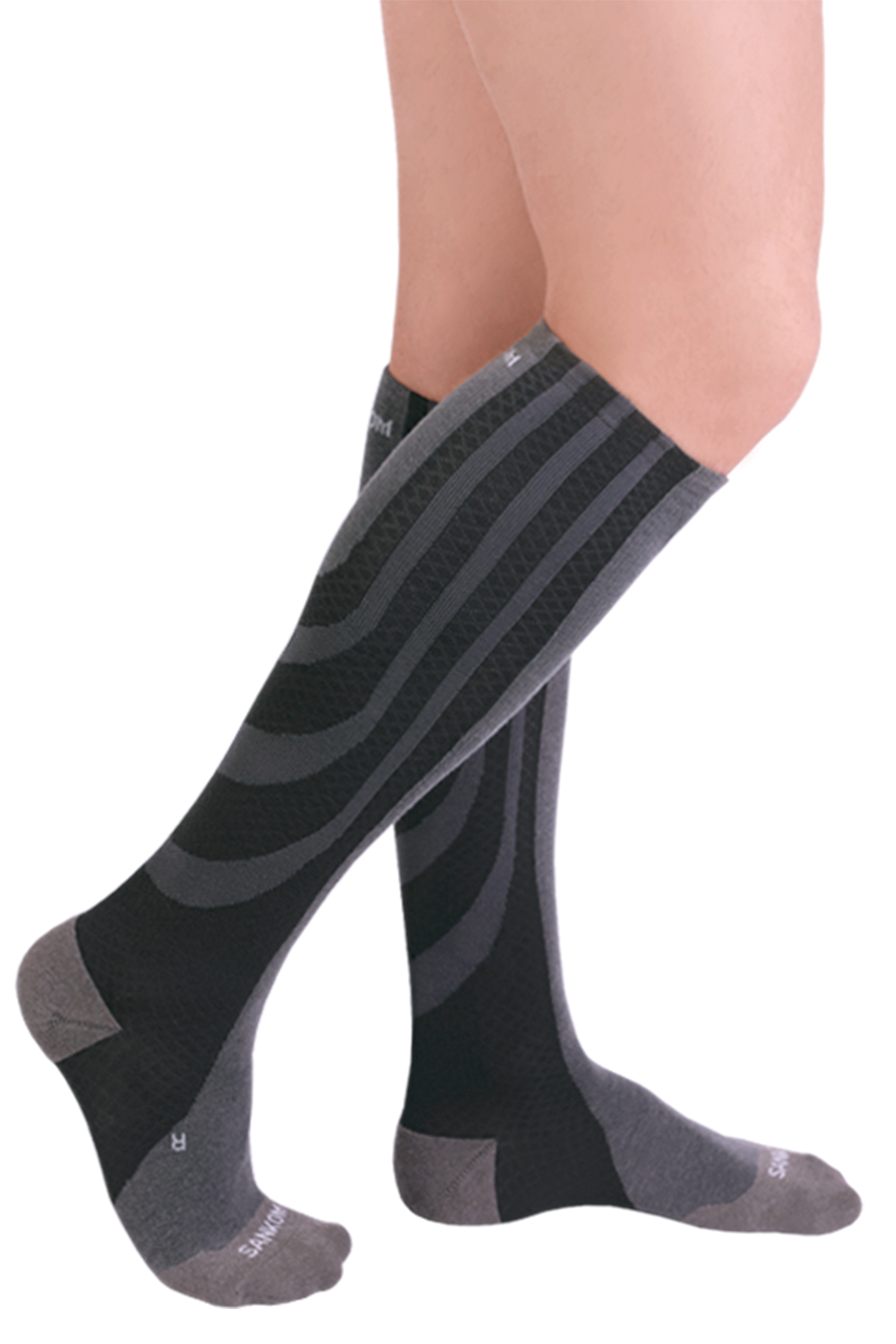 Sukkien neljän “kompressionauhan” porrastettu paine ohjaa tehokkaasti jalan verenvirtausta ja ehkäisee suonensisäisiä tukoksia. Toisin kuin tavallisen kompressiosukan jalkaa “ympäröivässä” kompressiossa, SANKOM-tukisukan “pituussuuntainen” kompressio vapauttaa veren virtaamaan tehokkaammin ylöspäin.